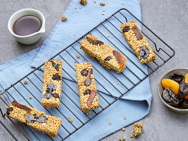 Ein Pausenriegel mit geballter Fruchtpower: Je nach Geschmack können hier Trockenfrüchte gemischt und mit Ahornsirup und -Zucker gesüßt werden. Ruhig etwas feuchter backen! Die Riegel sind eine Woche lang im Kühlschrank haltbar. Falls sie doch bröseln sollten, einfach als Granola auf Müsli oder Joghurt streuen.
